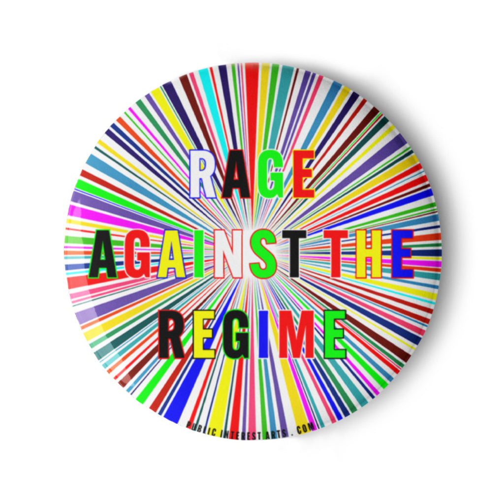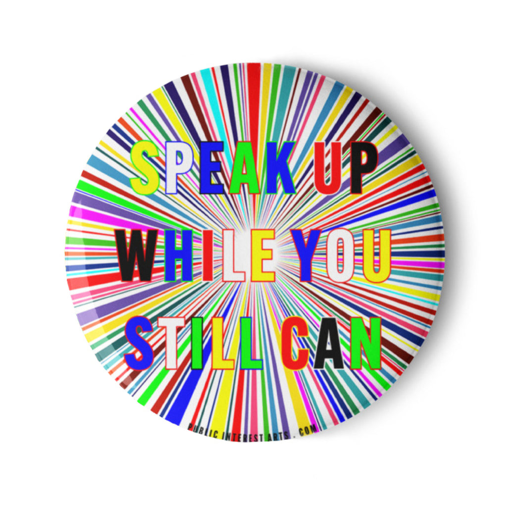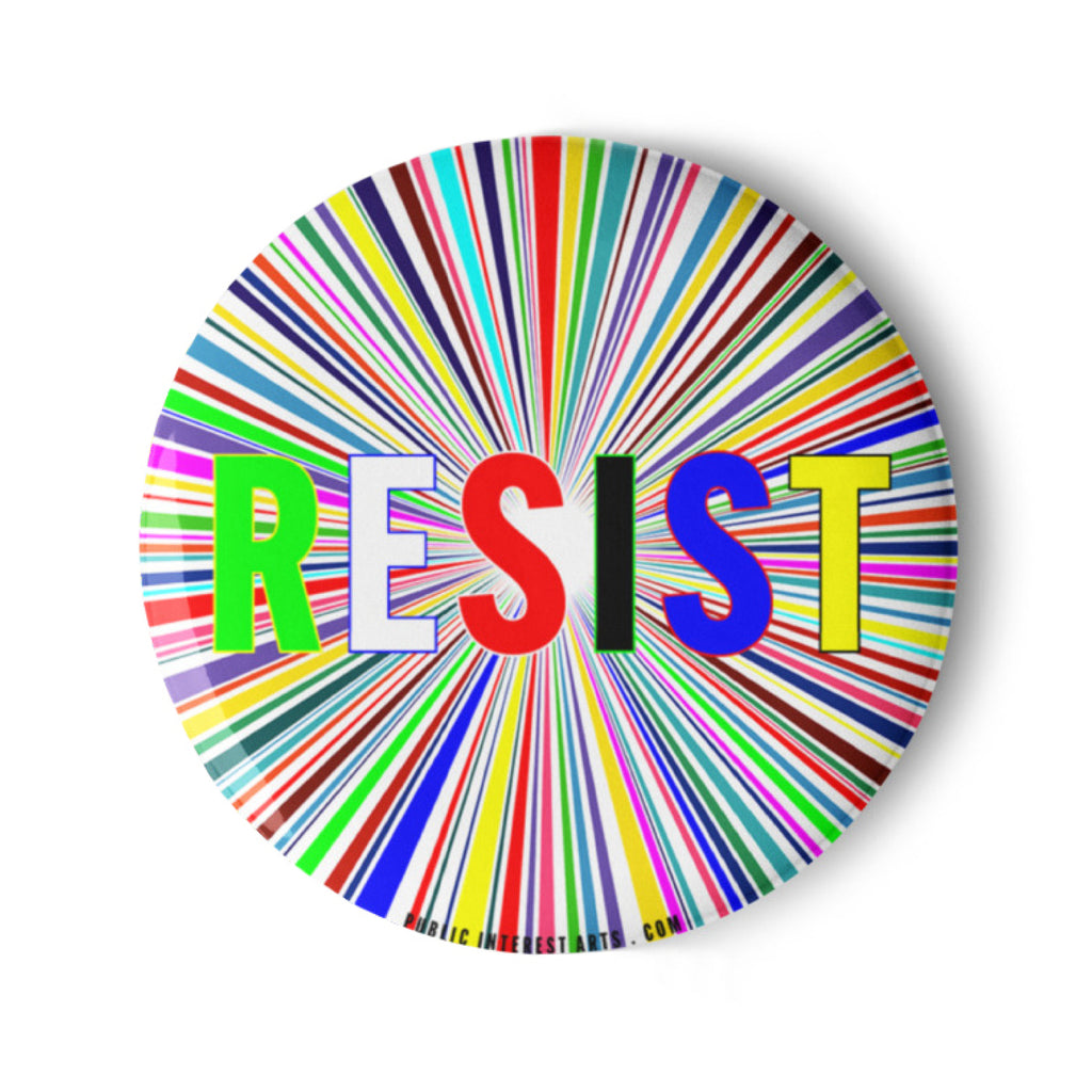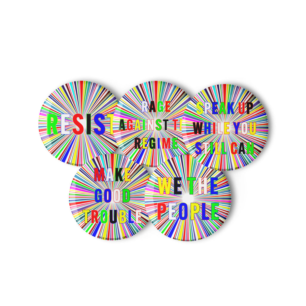 Set of 5 pins, each 2.25" in diameter. Art by Public Interest Arts.