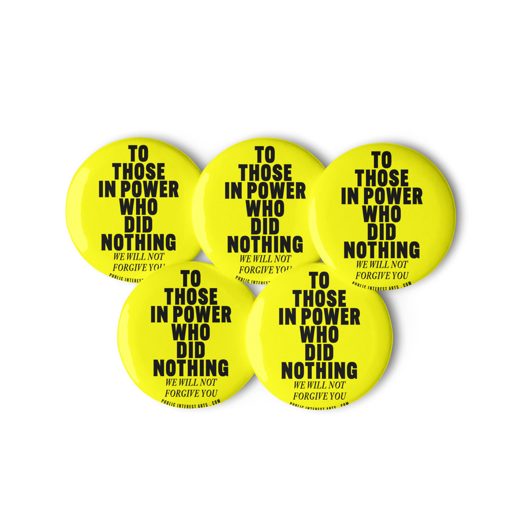 Set of 5 pins, each 2.25" in diameter. Art by Public Interest Arts.