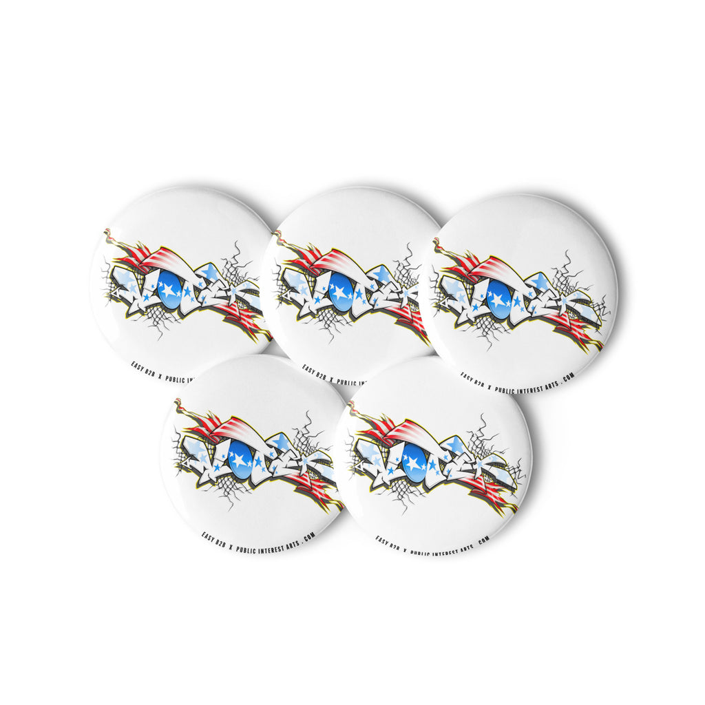 Set of 5 pins, each 2.25" in diameter. Art by Easy B2B.